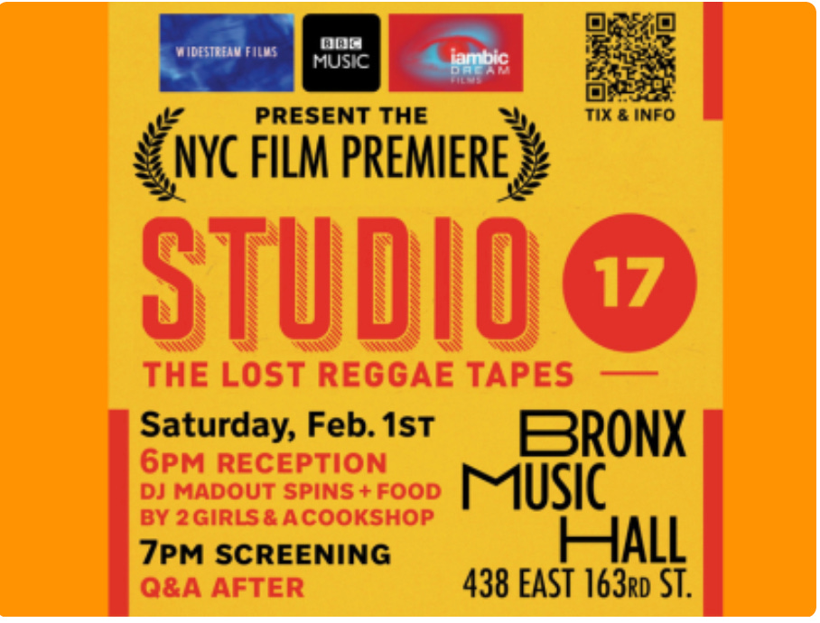 If you’re looking for an under the radar ringer, check out Bronx Music Hall (438 East 163rd Street at Brooke) on Saturday, February 1st when they will be premiering Studio 17: The Lost Reggae Tapes. The documentary film begins with the discovery of a trove of tapes from Studio 17 (aka Randy’s Records) in downtown Kingston, Jamaica. That record store, which was formed in the 60s by The Chins, a Chinese-Jamaican couple, became home to a studio for artists including Bob Marley! The cool doesn’t stop there. Doors open at 6 when there will be a reception featuring Jamaican food by 2 Girls & a Cookshop, the movie will screen at 7 and a panel discussion will follow the documentary. That panel discussion will include Studio 17 producer Clive Chin, so it’ll all be full circle. Tix are $15 and you can buy them here.