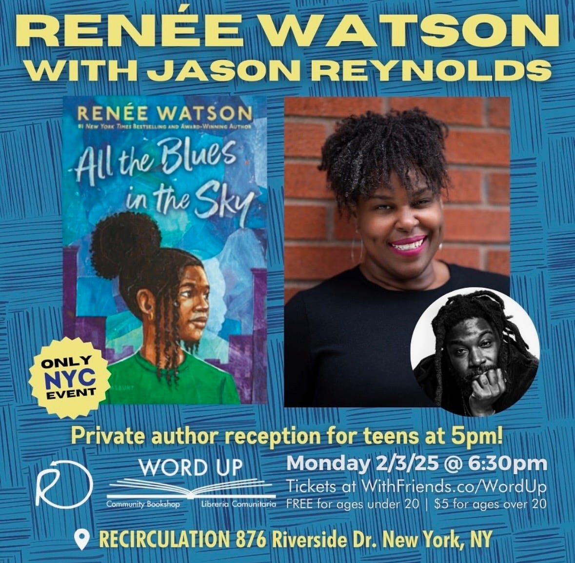 Our friend, all-around good neighbor and big deal author, Renee Watson, has a new book called All the Blues in the Sky. Technically, it’s a book for kids but we are assured there is something in there for everyone. You can pre-order said book here—it is set to be released on February 4th. OR you could just go meet Renee in person next Monday, February 3rd at 6:30pm at Recirculation (876 Riverside Drive at West 160th Street) which is a Word Up Bookshop project—but you already knew that because you read every word of our newsletters. BONUS: there is a private author reception for Teens that will start at 5:00pm. If you mention Above The Park, Renee will sign your book, give you a high five and even take a picture with you FOR FREE. It is possible, I guess, Renee will do all of those things regardless, but do you really want to chance it??? Tix are free if you’re under 20 and $5 if you’re not. Options to add on a copy of Renee’s new book or buy a book for one of the youths that still read them. Get your tickets here.